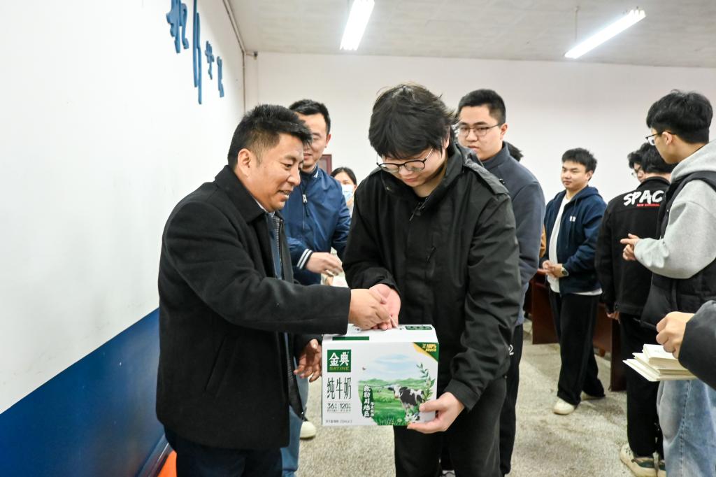 活动现场,学院为每位考研学生精心准备了一箱营养牛奶,寓意“加油补给、能量满满”,助力同学们以最佳状态迎接挑战。每份礼包中还附有一张由学院领导、教师及在校同学亲手绘制的祝福明信片。明信片上或写有“一战成硕”“金榜题名”的鼓励话语,或绘有灯塔、帆船、星光等象征希望与远航的图案,字里行间饱含深情,笔触之中尽显关怀。