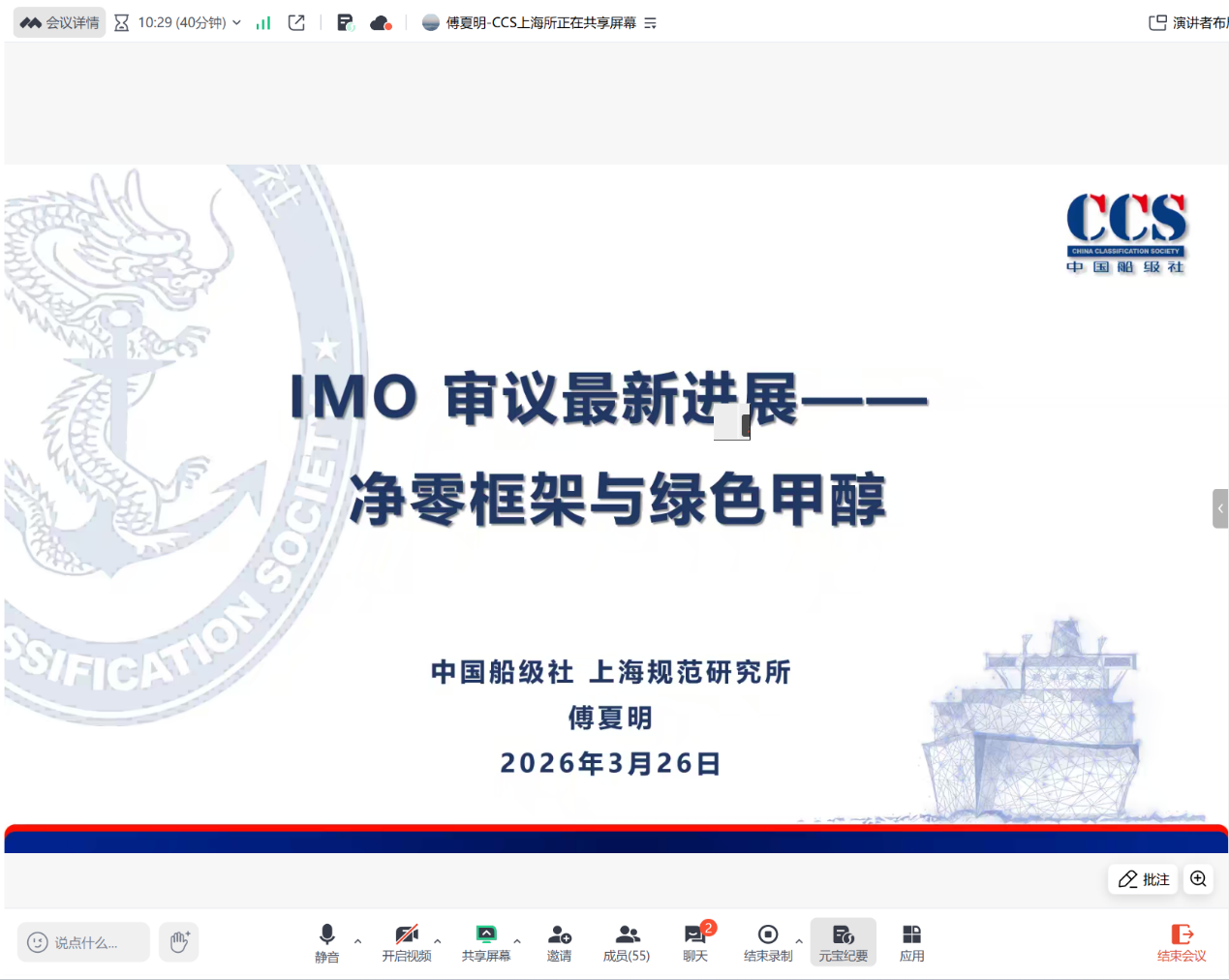 3月26日,重庆交通大学“高性能舰船前沿技术”微课以线上形式举行。中国船级社上海规范研究所高级工程师傅夏明应邀作题为“IMO审议最新进展——净零框架和绿色甲醇”的专题讲座。