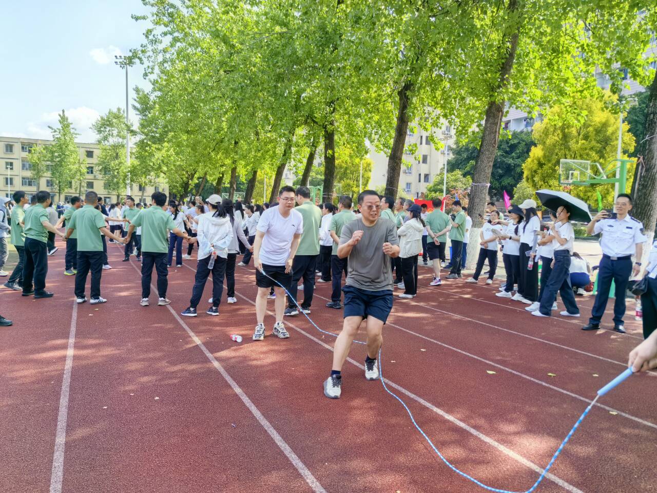 广播体操表演环节,全院参赛教职工整齐列队、精神抖擞,伴随着激昂的音乐,动作标准规范、整齐划一,举手投足间展现出良好的精神风貌与集体荣誉感。每一个伸展、每一次弯腰、每一回转身,都整齐有力、协调一致,充分体现了“全院一条船”心往一处聚、劲往一处使的团结精神;在欢乐龙舟项目中,20名参赛老师步伐一致、节奏同步,喊着整齐划一的口号,双腿协调摆动、身体协同前进,如同一艘乘风破浪的龙舟,在赛道上飞速前行,每一步都踏得坚定有力、每一个动作都配合得精准默契,充分展现了航运人步调一致、团结奋进的精神风貌;长绳比赛中,老师们一个接一个轻盈地跃入绳圈,鱼贯而出,衔接流畅,几乎没有任何停顿,彰显着团队无缝衔接、同心协力的强大合力。