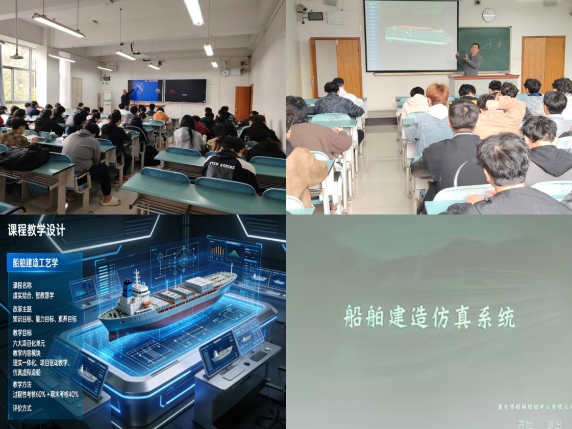 课堂上,教师充分利用学院最新购置的船舶建造仿真系统,将船坞总装、分段吊装等高风险、高成本的建造环节“搬”进教室,学生通过操作仿真平台,模拟建造流程、预判潜在问题。结合智慧教室的多屏互动、实时投屏等功能,教师可随时调取仿真数据、展示学生设计方案、组织现场点评,课堂从单向讲授转变为师生共建的探究式场域。