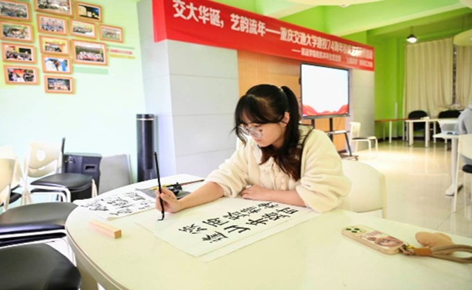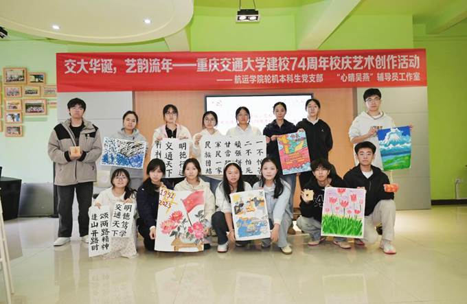 七十四载春华秋实,匠心笔墨共绘锦绣前程。2025年11月12日下午,重庆交通大学南岸校区第三办公楼二楼团辅室内气氛热烈,由航运学院轮机本科生党支部联合“心晴吴燕”辅导员工作室共同举办的“交大华诞,艺韵流年——重庆交通大学74周年校庆艺术创作活动”在此顺利开展。活动以传统技艺致敬峥嵘岁月,用艺术作品献礼母校华诞,激励青年学子扎根航运、奋发有为,谱写投身学校发展的新篇章。