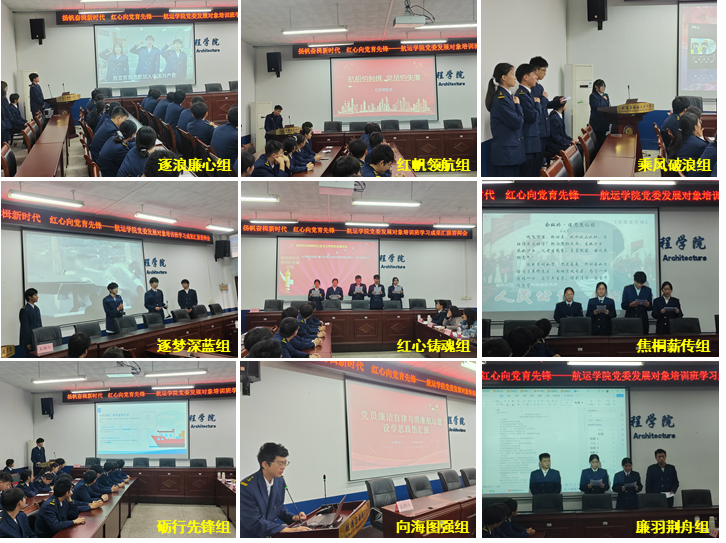 来自学院党校41名发展对象分属9个小组,围绕福建舰入列授旗、海洋强国、“两路”精神、廉洁自律等核心议题,以诗朗诵、情景剧、歌曲演唱、PPT讲解等多元形式展开汇报,既有理论深度、专业厚度,又具青春热度,充分彰显了新时代航运学子的政治自觉与青春担当。