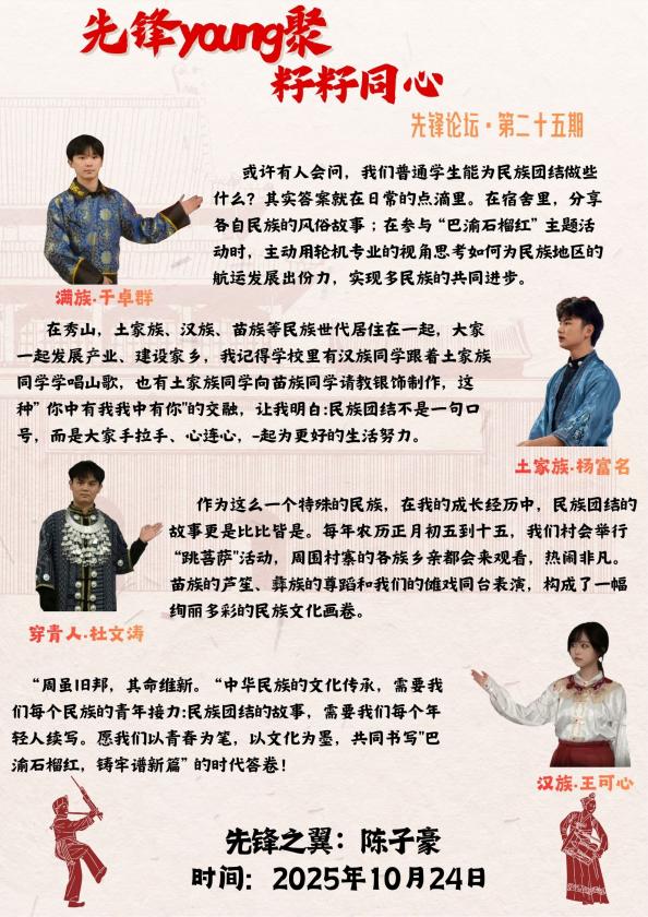 为深入贯彻习近平总书记关于加强和改进民族工作的重要思想,贯彻落实党的二十届四中全会精神,10月24日,航运学院部分少数民族师生参与“先锋young聚,籽籽同心”为主题的先锋论坛,本期主题聚焦民族团结进步宣传月活动,旨在以 “石榴籽” 精神为纽带,将民族团结教育融入学生成长全过程,在沉浸式演绎中生动阐释中华民族共同体意识的深刻内涵与时代价值。