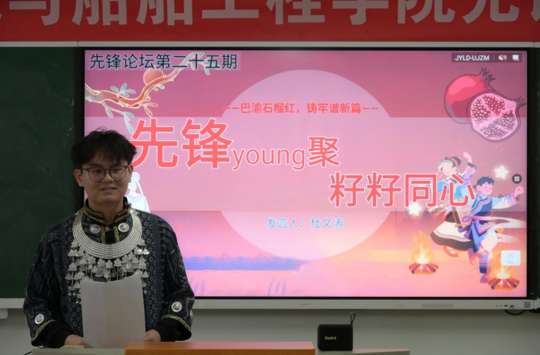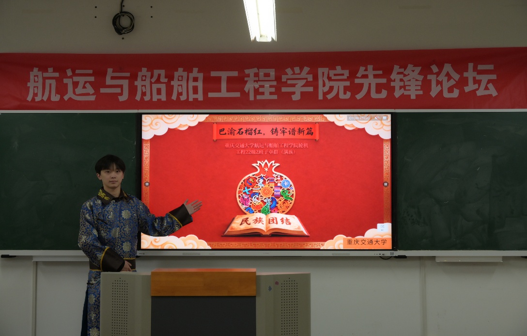 “素雅端方,盘扣虬结流露出天圆地方的深刻意象。”来自满族的轮机2202班于卓群深切谈到,从白山黑水到长江之滨,以“打千礼”的谦卑致敬严谨的科研态度,用“颁金节”的热望熔铸家国情怀,那些镌刻在齿轮齿缝间的民族智慧,终将汇入长江黄金水道,载着“巴渝石榴红”的种子,驶向深蓝!而这份将民族特色与家国发展紧密相连的情怀,在接下来的篇章中,以另一种独特的姿态在酉水河畔绽放。